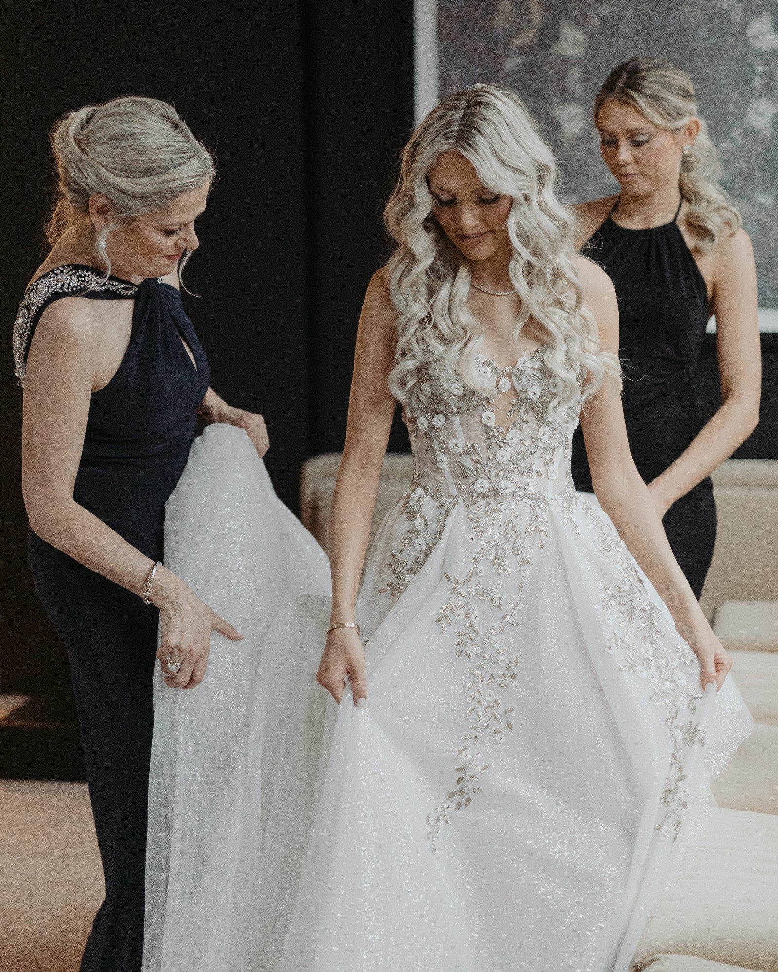Experience sheer luxury with this two tone 3D embroidered a-line style beaded wedding gown. Its flowing silhouette is complemented by intricate beading, and intricate embroidery in shades of ivory and champagne. Fall in love with this timeless and elegant piece of bridal couture.