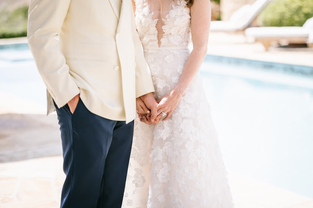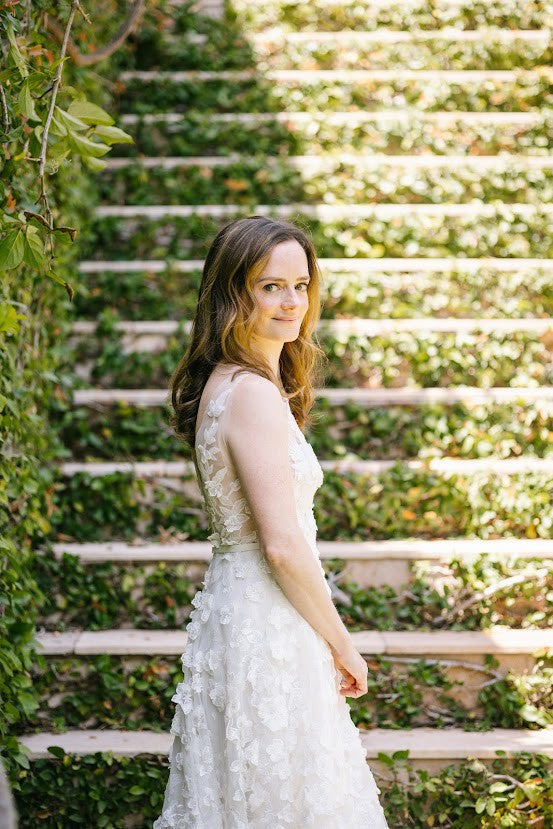 Elevate your special day with this breathtaking sleeveless a-line wedding gown decorated in a delicate flower motif. Its timeless silhouette, light and airy construction, and intricate detailing make it an exquisite and unforgettable choice for your perfect celebration.