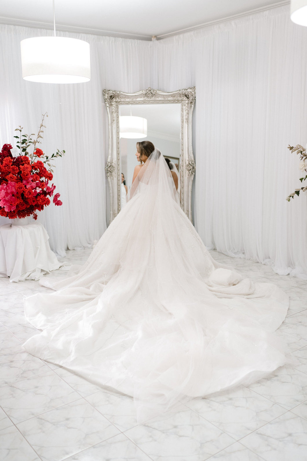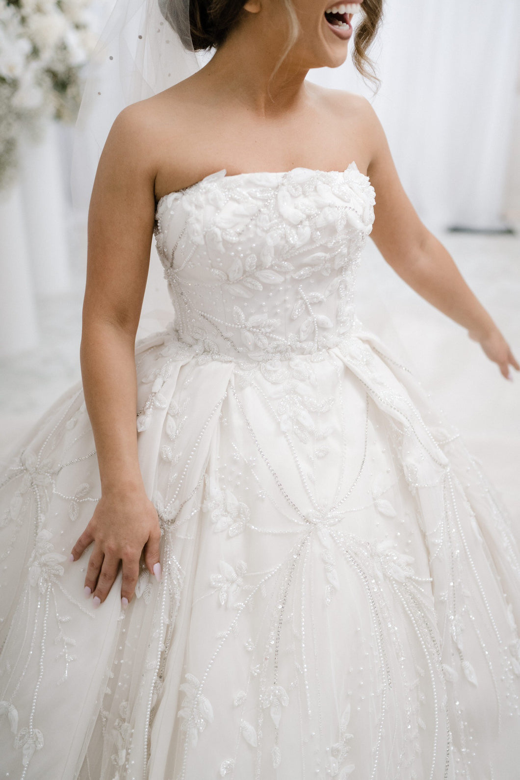 C2023-SBG45 - strapless ball gown wedding dress with 3D embellishments & chapel train