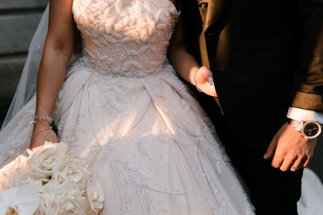 Make your grand entrance in timeless elegance wearing this exquisite C2023-SBG45 Strapless Ball Gown Wedding Dress. Featuring a classic strapless silhouette, delicate 3D embellishments, and a graceful chapel train, this breathtaking gown will make you look and feel like a princess. Transform your wedding day into a memorable work of art!