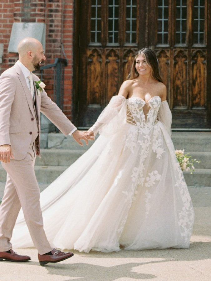 Achieve timeless elegance in this strapless, A-line ball gown wedding dress. Crafted with exquisite attention to detail, this delightful design features detachable sleeves for an adjustable look that fits any occasion. From the aisle to the dance floor, you'll look pure perfection in luxurious style that is as timeless as your love.