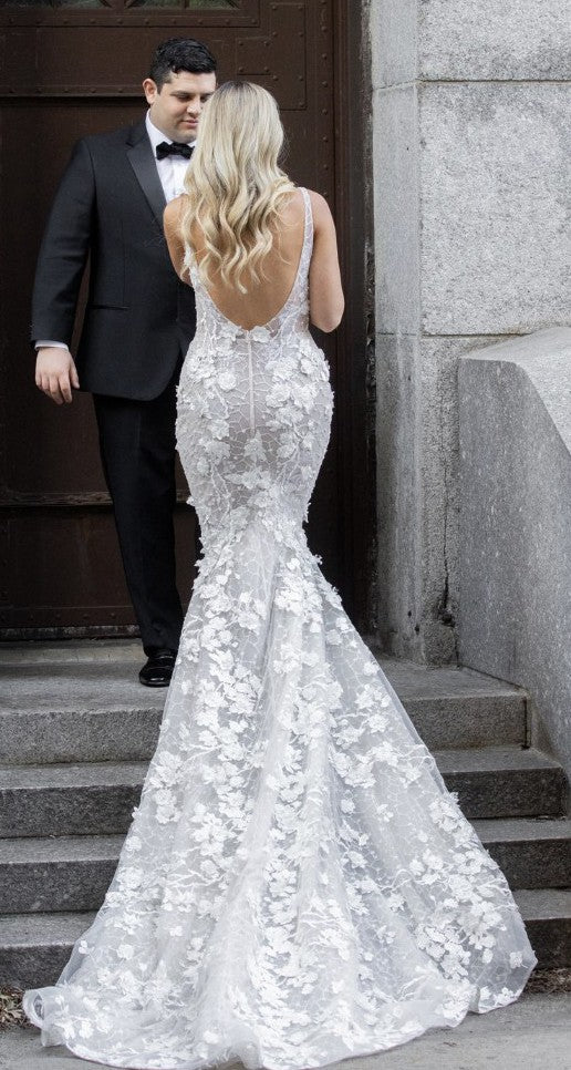 Embrace pure sophistication with this elegant beaded lace wedding gown. Featuring a backless fit-and-flare silhouette and intricate detailing, you'll look immaculate and refined on your special day. Infuse timeless beauty into your ensemble and be the picture of posh perfection.