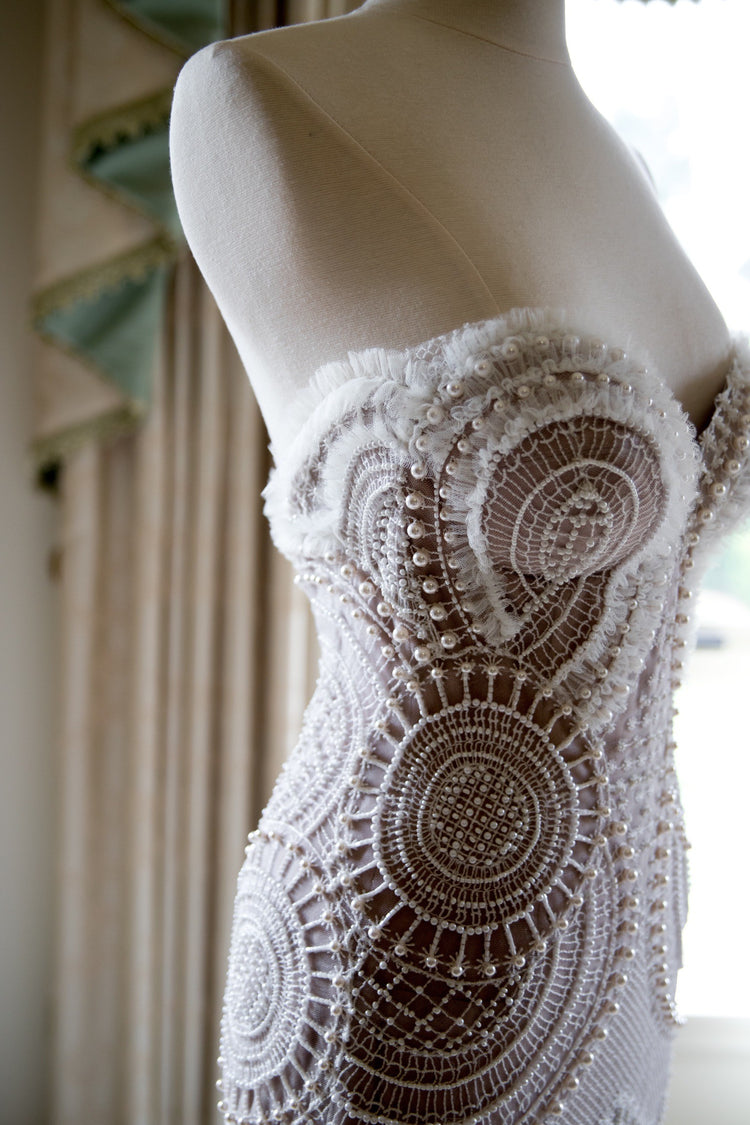 C2023-SE35 - strapless sweetheart embroidered lace wedding gown with split and train
