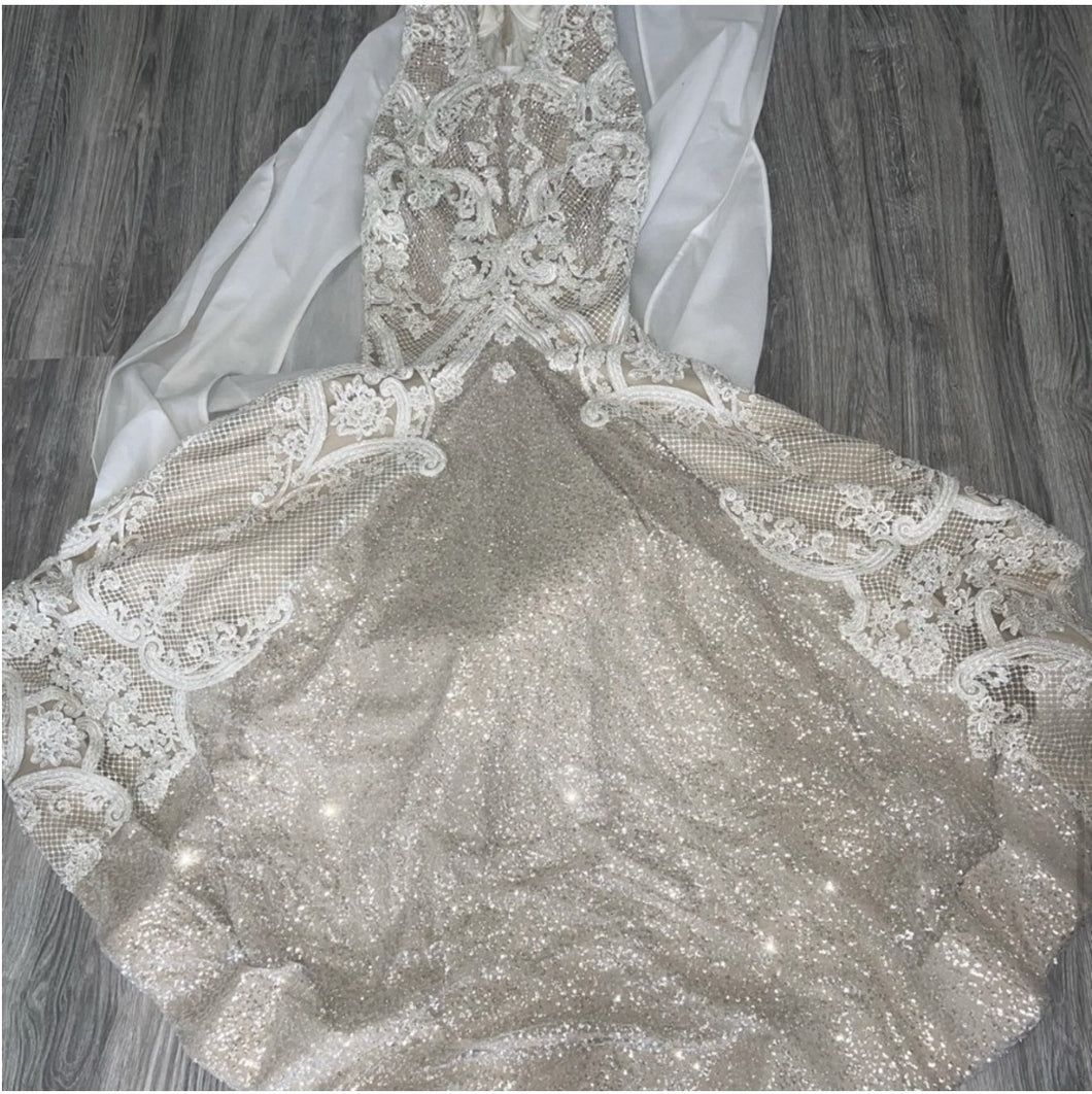 Experience modern sophistication in this stunning strapless beaded fit-to-flare wedding gown. The glittering beadwork delicately catches the light, while the detachable satin train adds a touch of luxury. Perfect for showcasing your beauty on your special day.