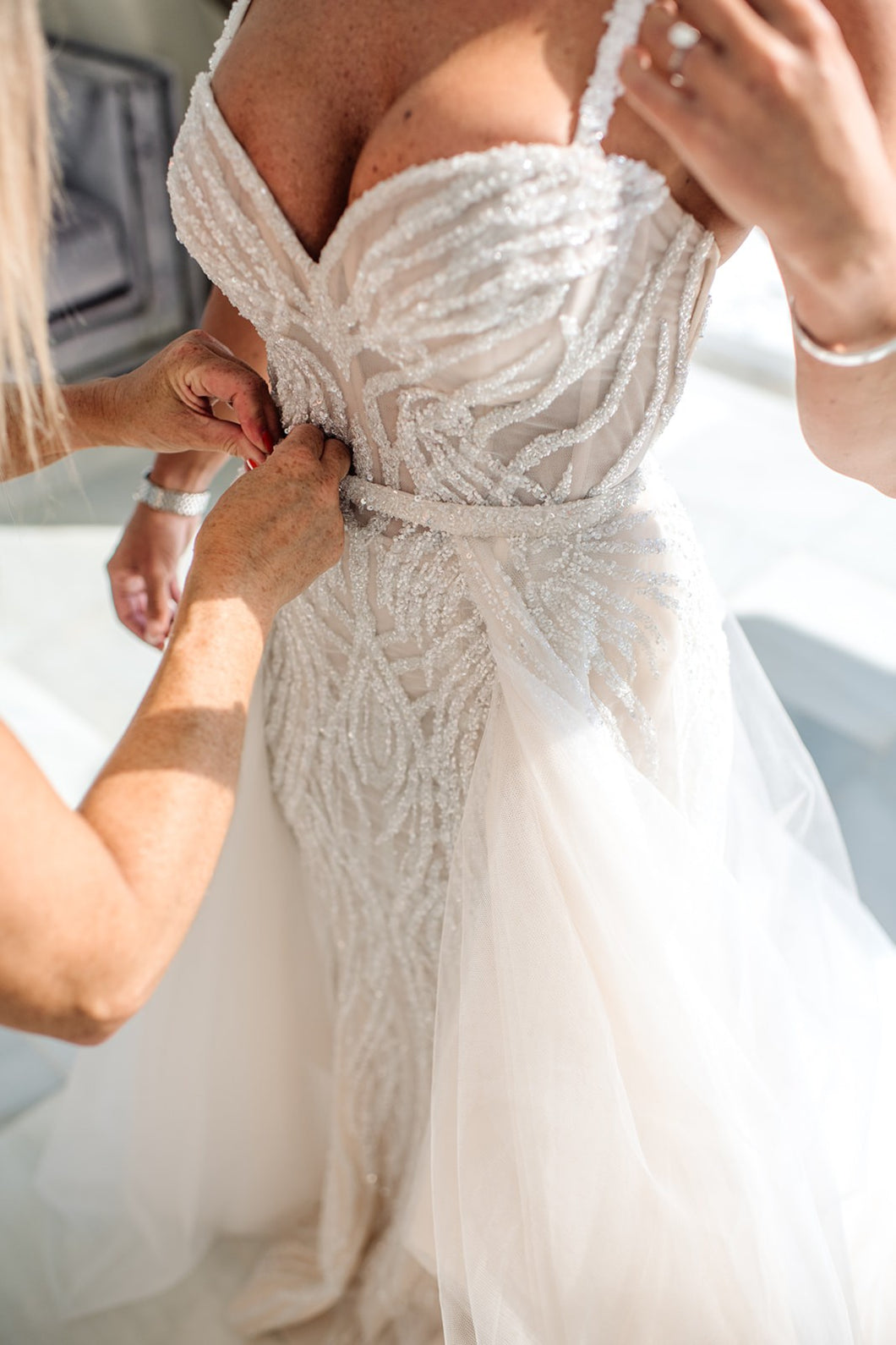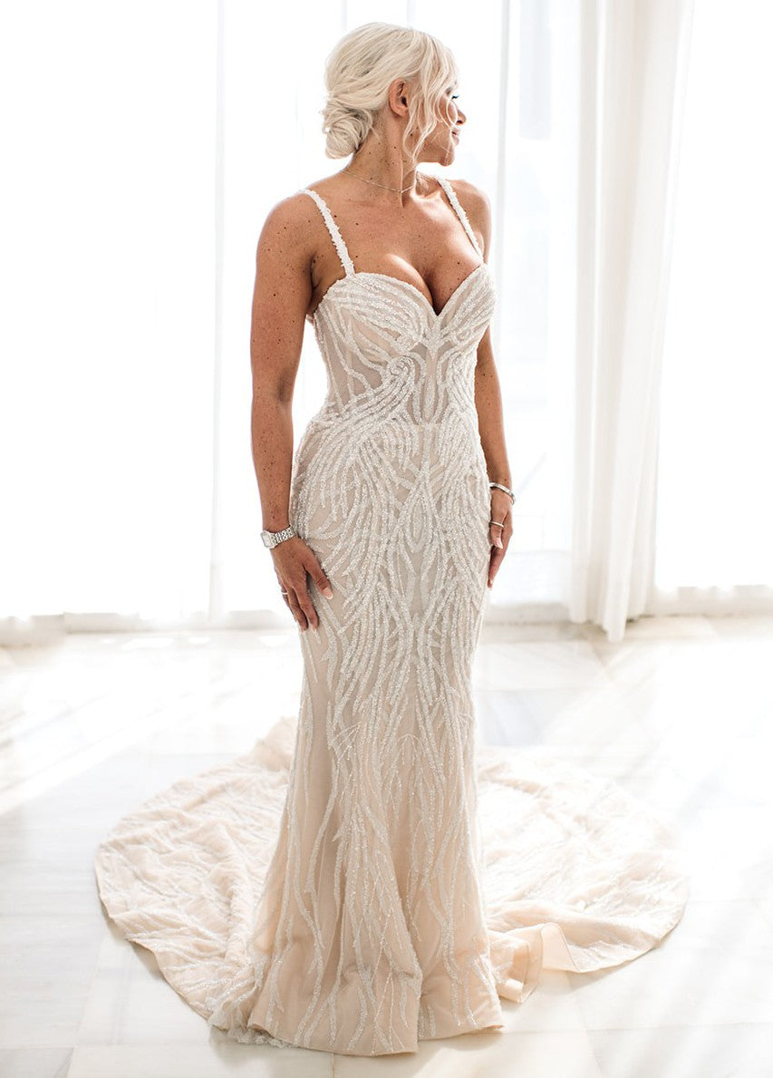 C2023-SS83D - spaghetti strap sweetheart beaded wedding gown with overskirt