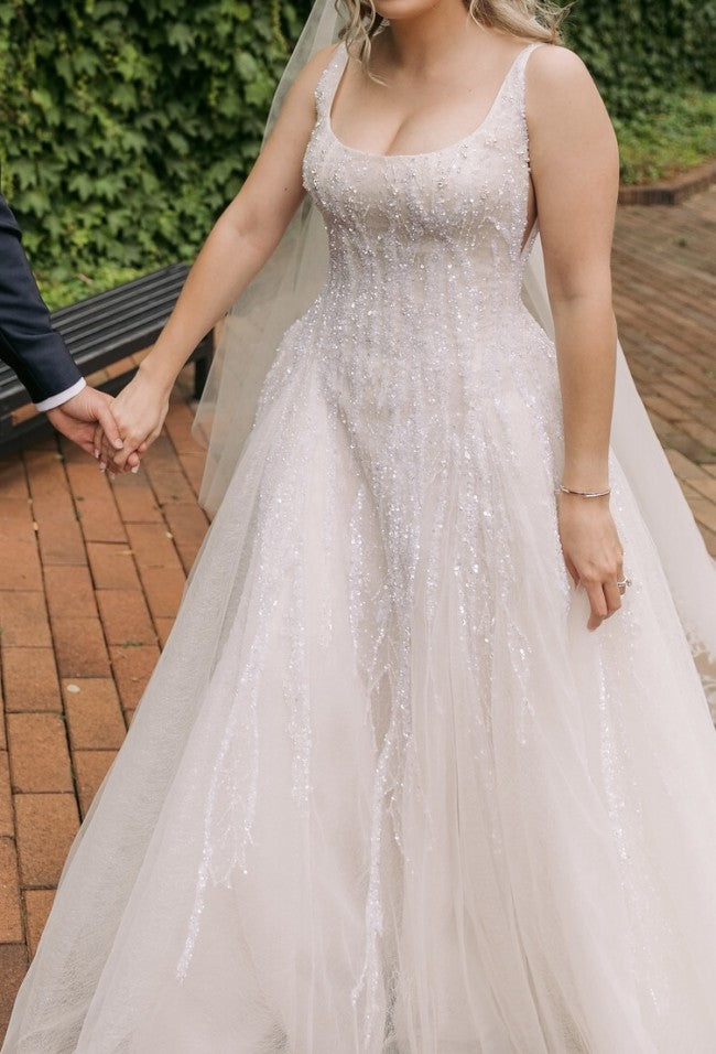 This sleeveless scoop neck plus size beaded wedding gown can be made as pictured. You can also request modifications.