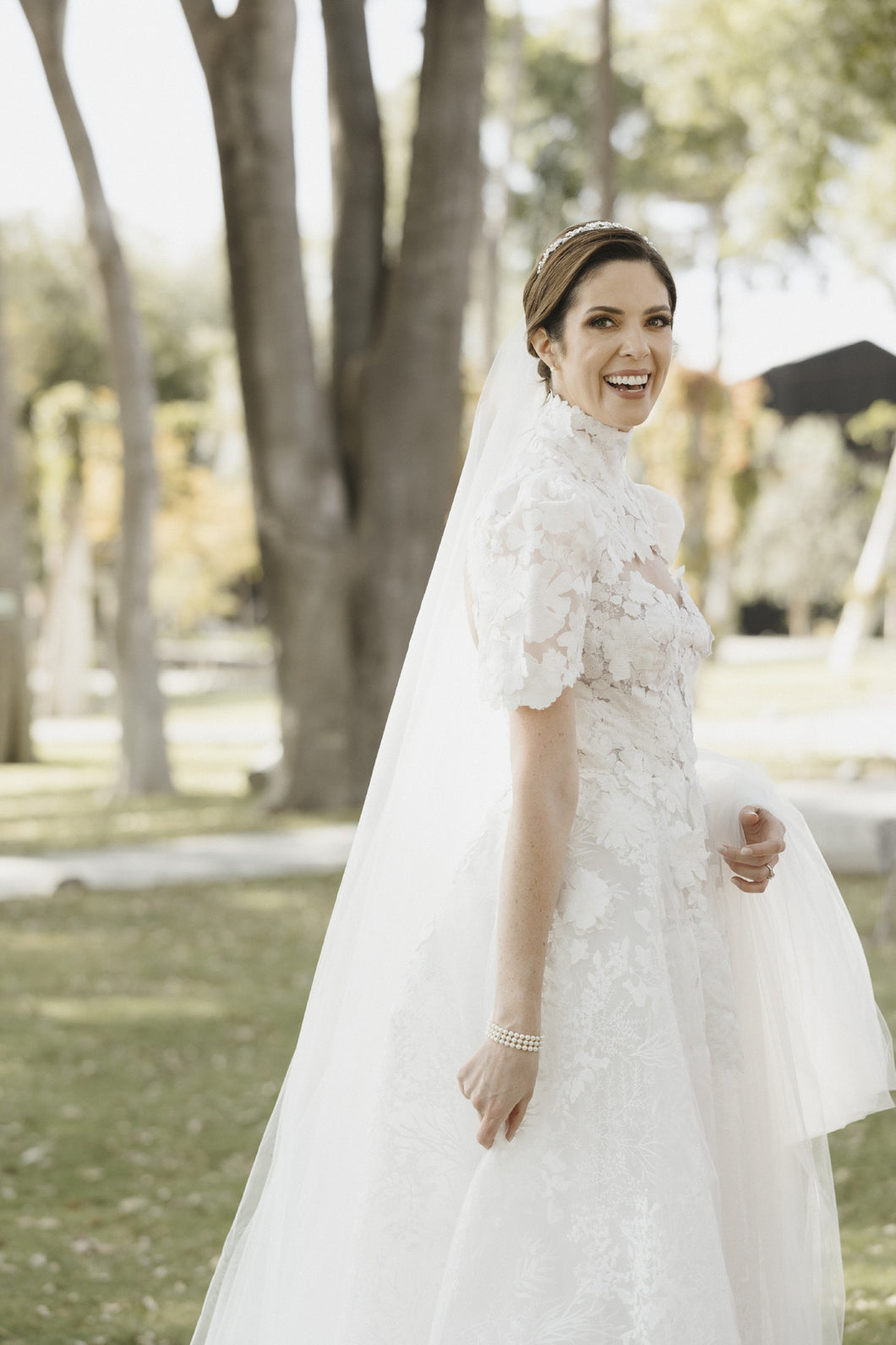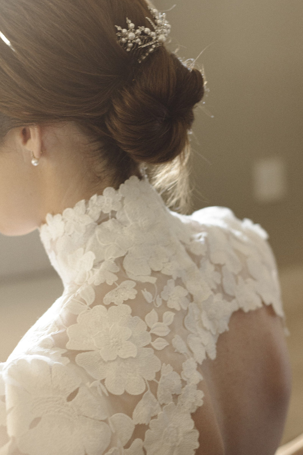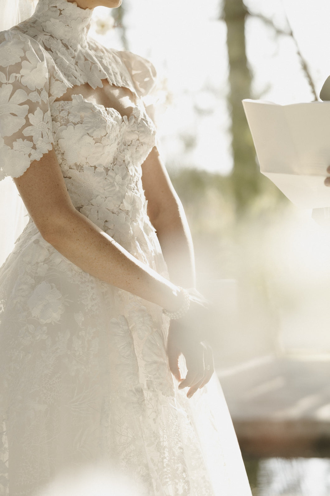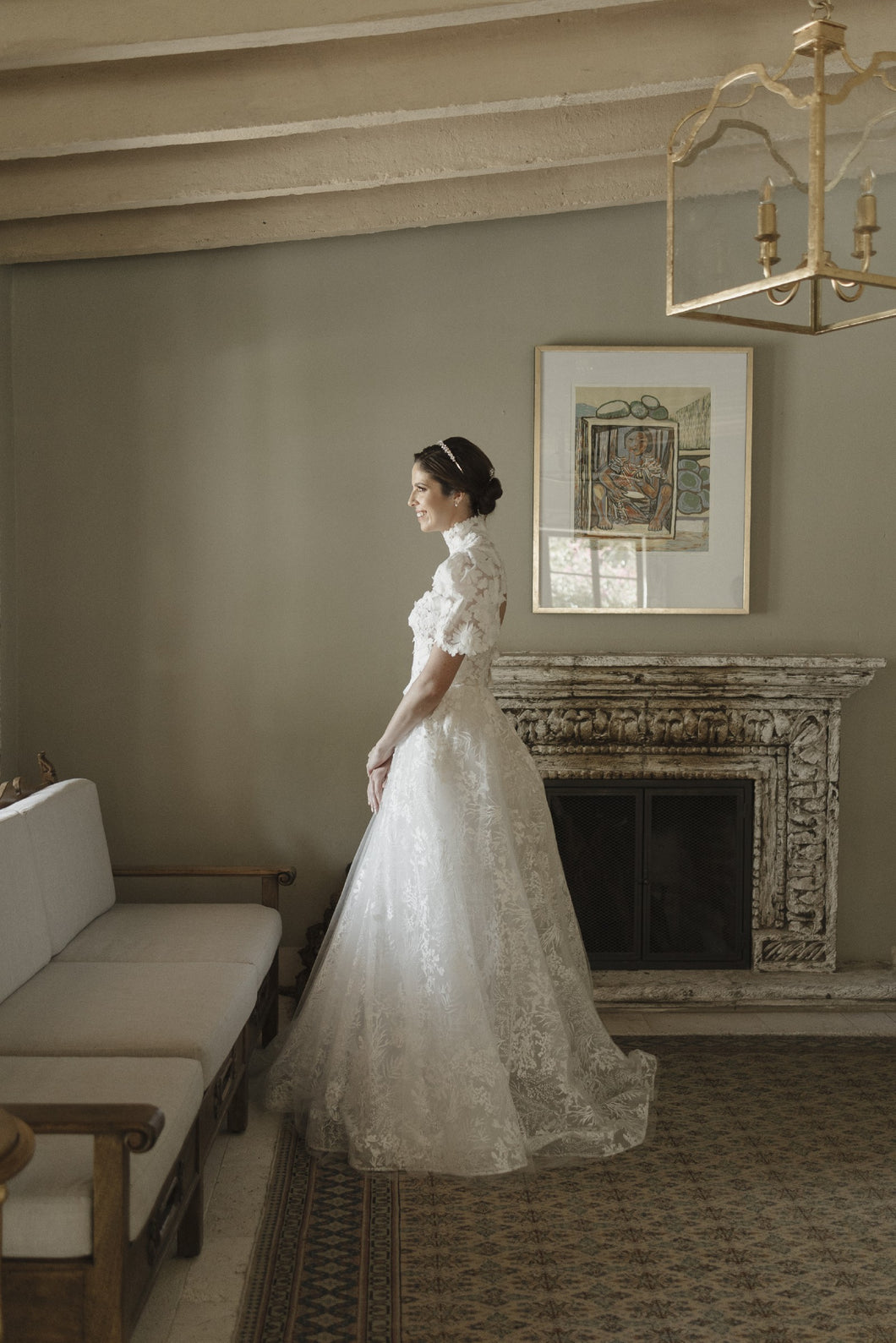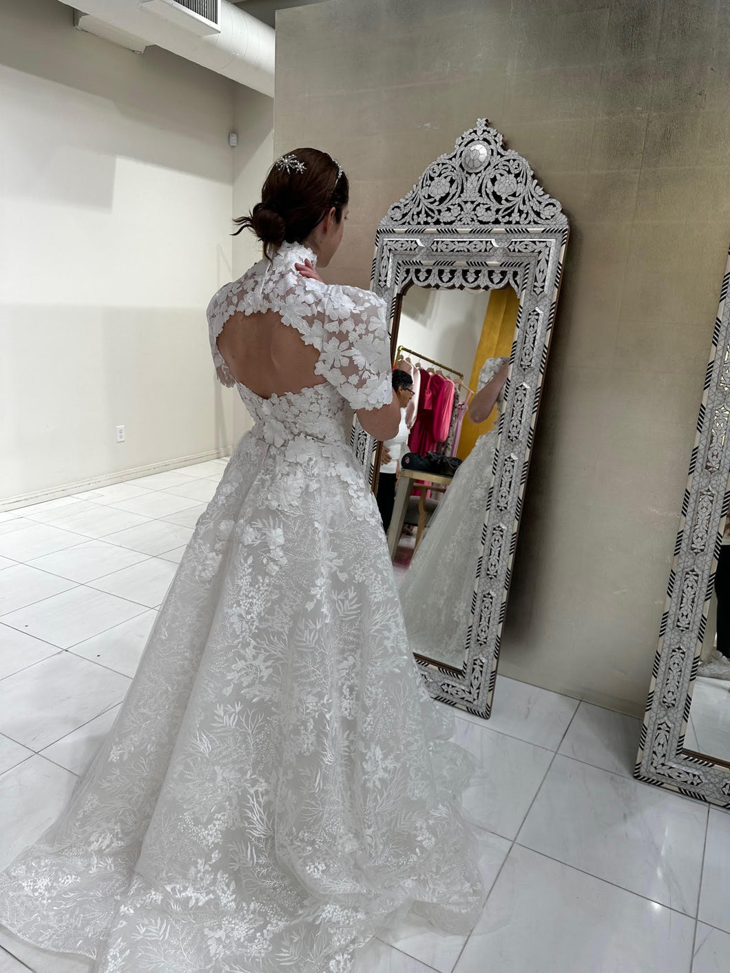 Introducing C2023-SS924, an exquisite short sleeve wedding gown with a high collar and romantic keyhole back detail. Crafted from the finest materials and designed with the utmost attention to detail, this timeless dress will elevate your special day into an unforgettable experience.