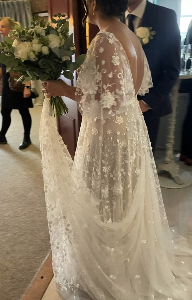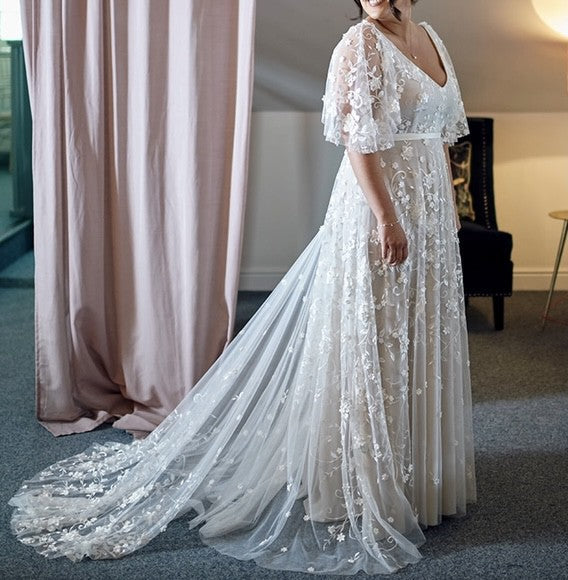Get this sheer elbow length long sleeve plus size wedding gown as pictured or with any changes.