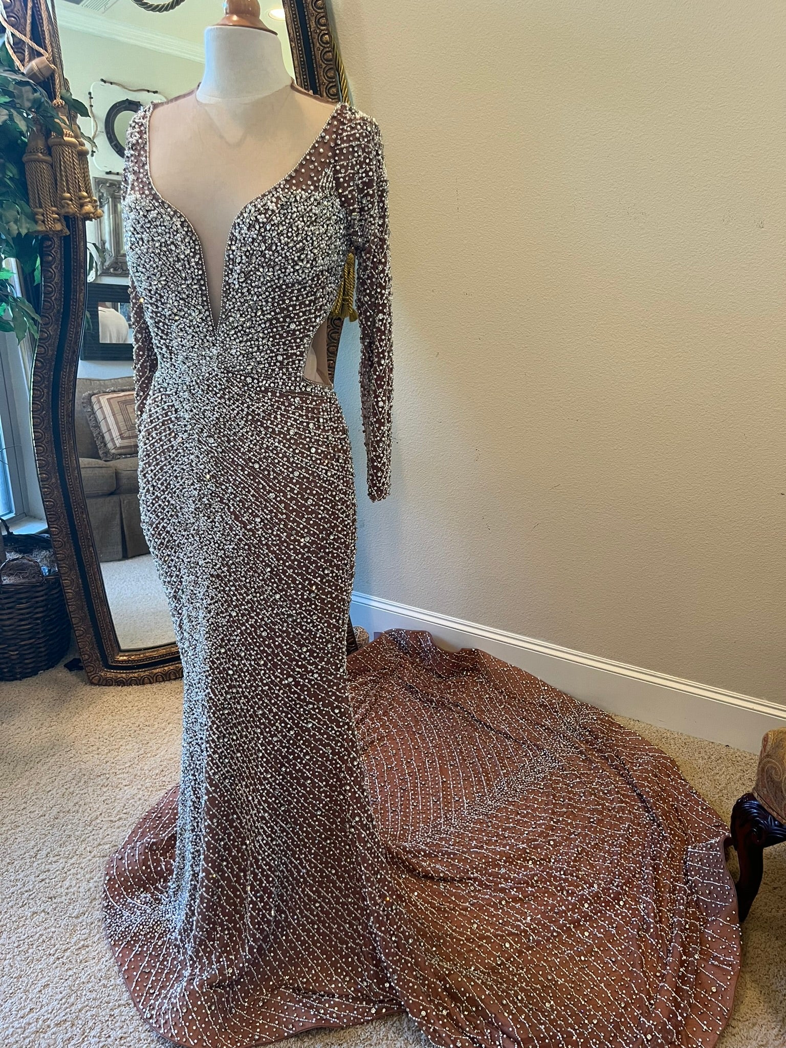 Indulge in the ultimate luxury with our C2023-SWeeksD Long Sleeve Pageant Gown. Adorned with dazzling rhinestones and lustrous pearls, this replica gown will have you radiating elegance and sophistication. The long sleeves add a touch of refinement, making it the perfect choice for any formal event. Elevate your style and stand out from the crowd in our stunning pageant gown.