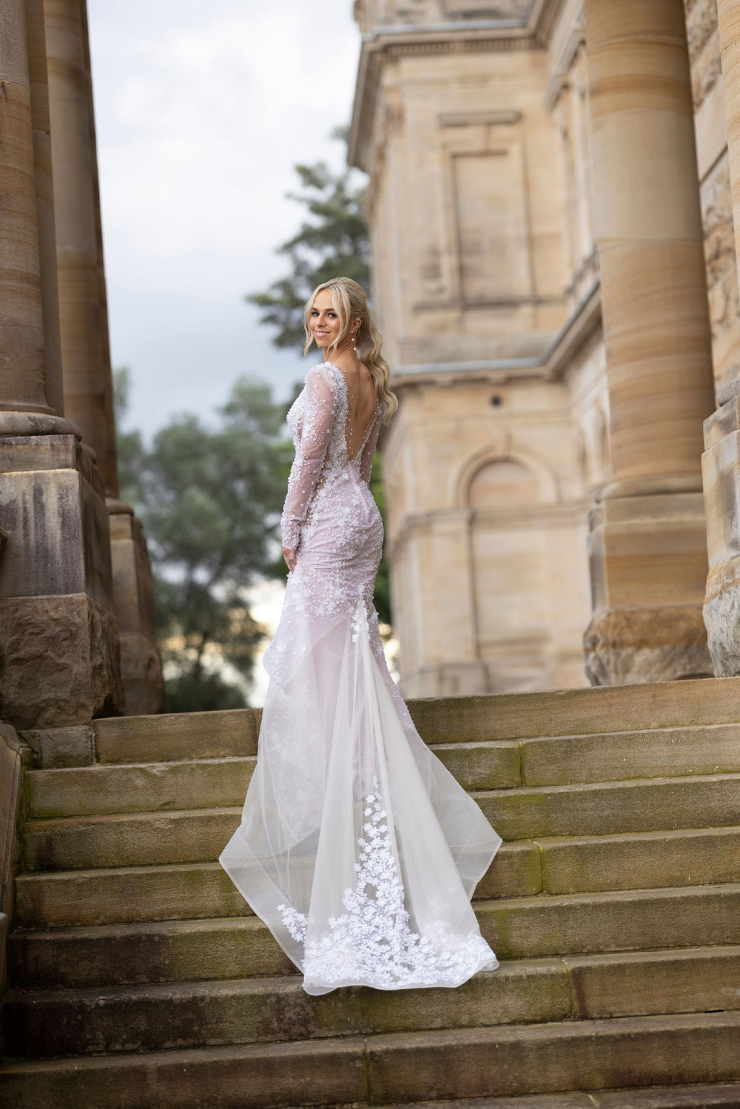 Make a statement on your special day with this stunning wedding gown. Crafted in a luxurious fabric with a seductive v-neck and alluring long sleeves, each bead delicately sparkles in the light. The attached veil brings a perfect finishing touch to help you look and feel your most beautiful.