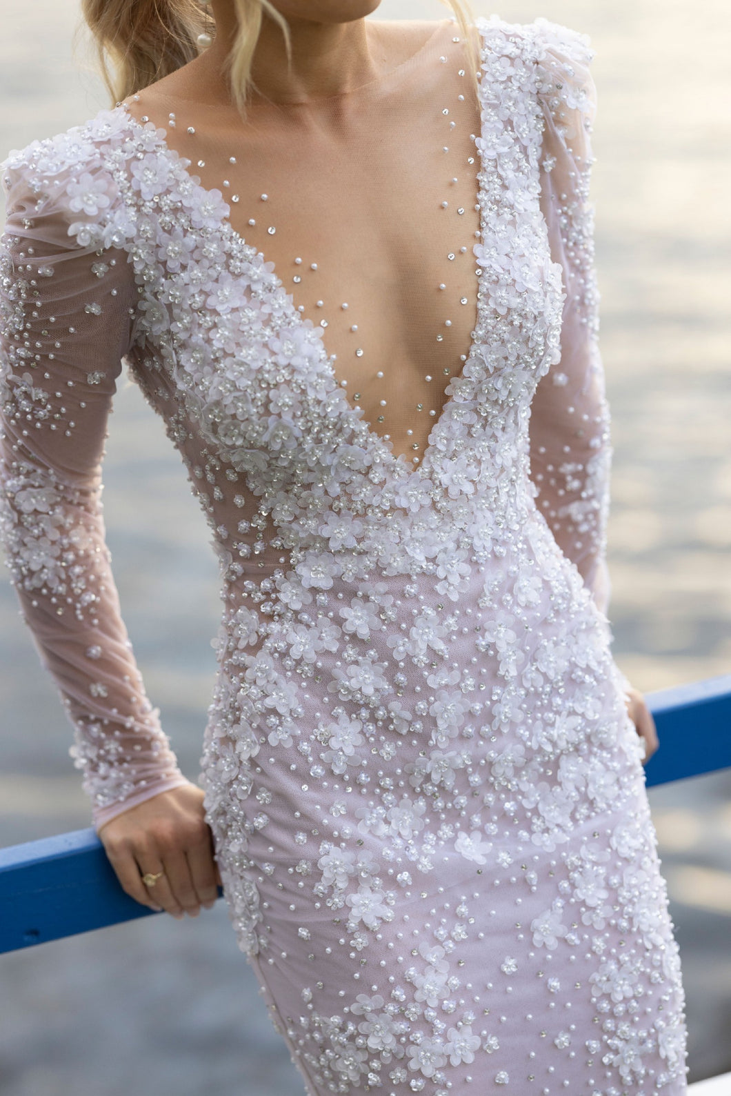 C2023-VLS - sexy v-neck beaded long sleeve wedding gown with veil