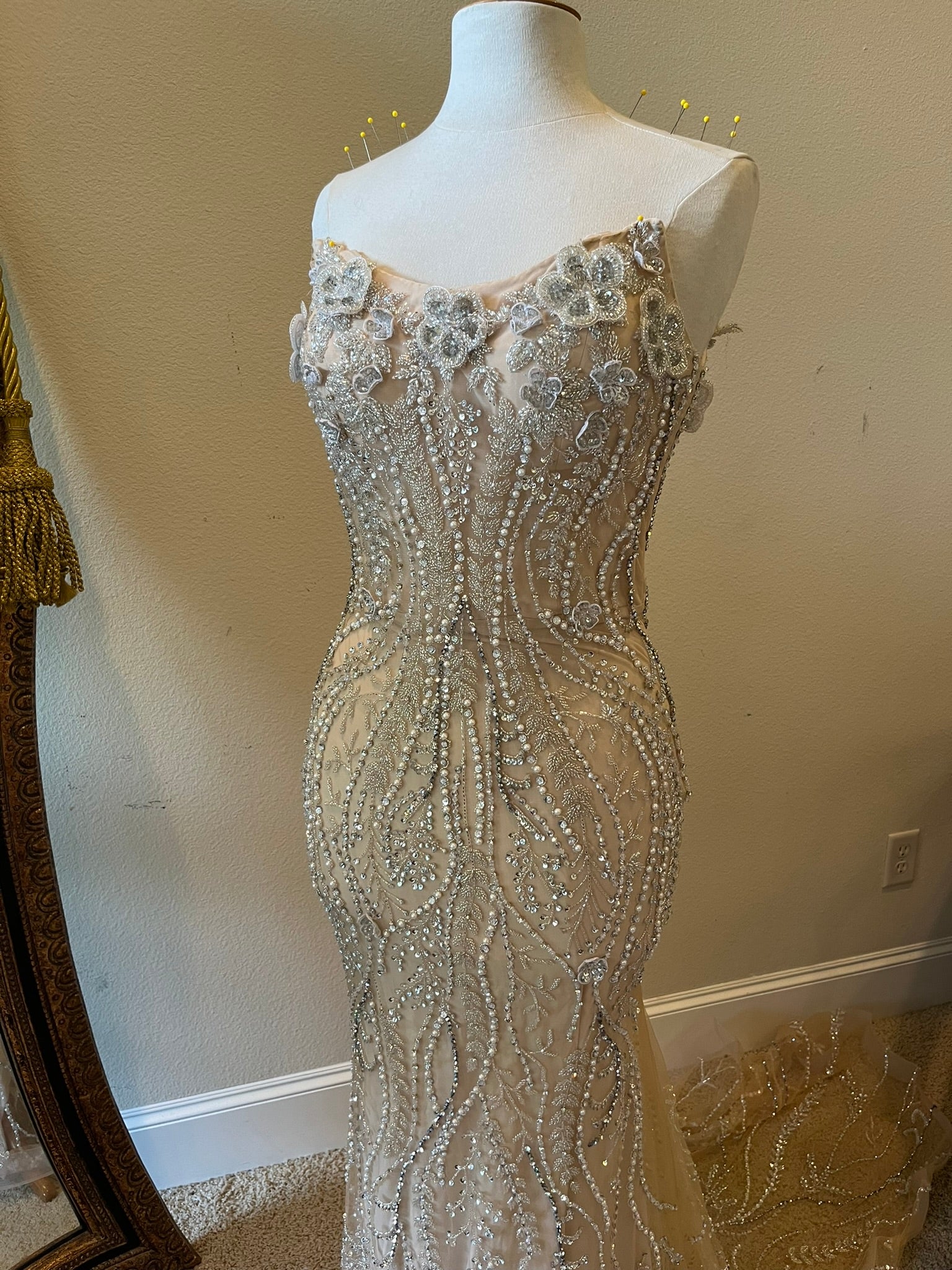 Indulge in luxury with our style C2024-IA which is a replica gown by Darius Cordell. This strapless evening gown is adorned with intricate beadwork, making it perfect for a glamorous Prom or Pageant event. Let this replica gown make you the center of attention with its elegant and exclusive design.