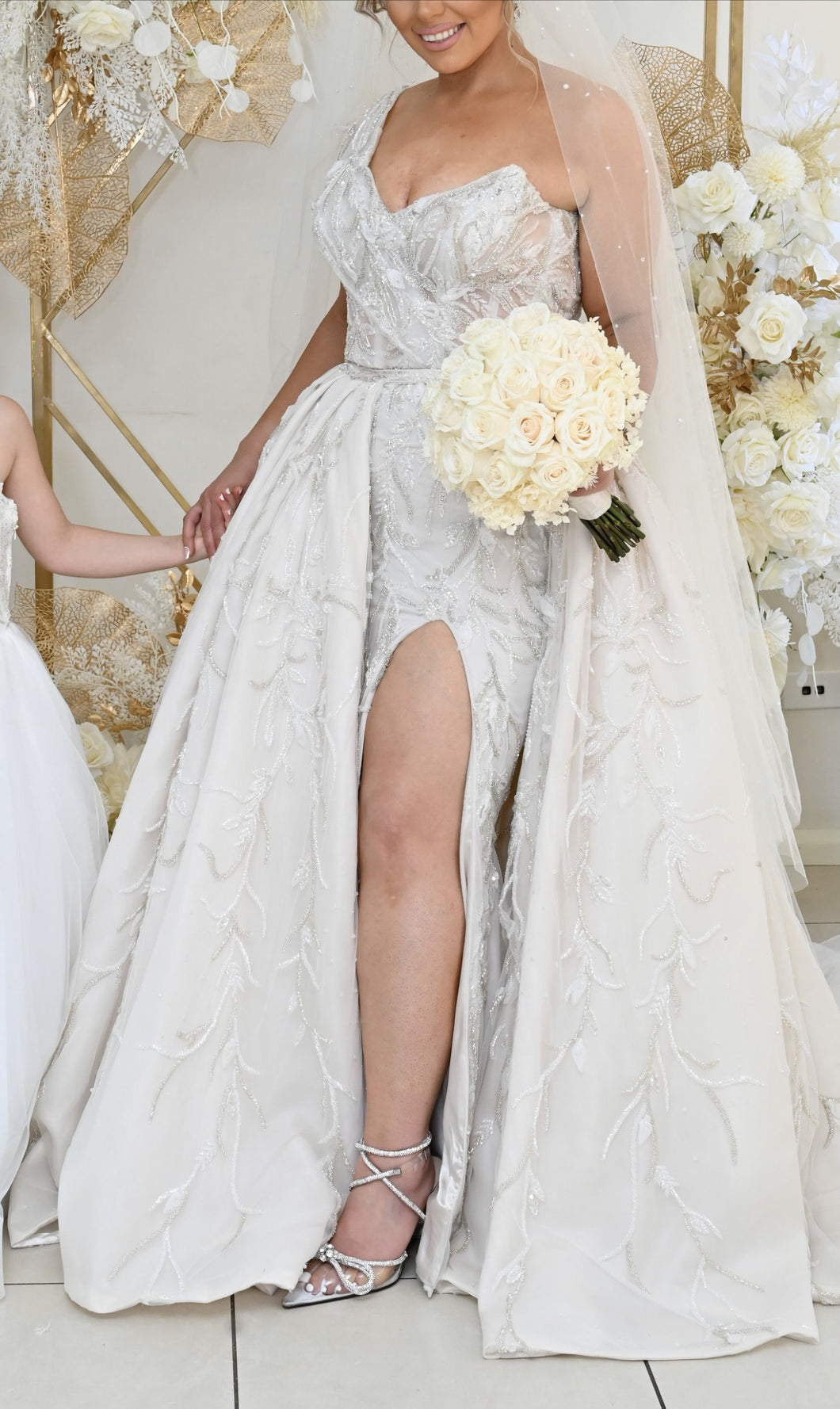 Get this  strapless ball gown wedding dress with detachable train and leg split made as shown or with any changes.