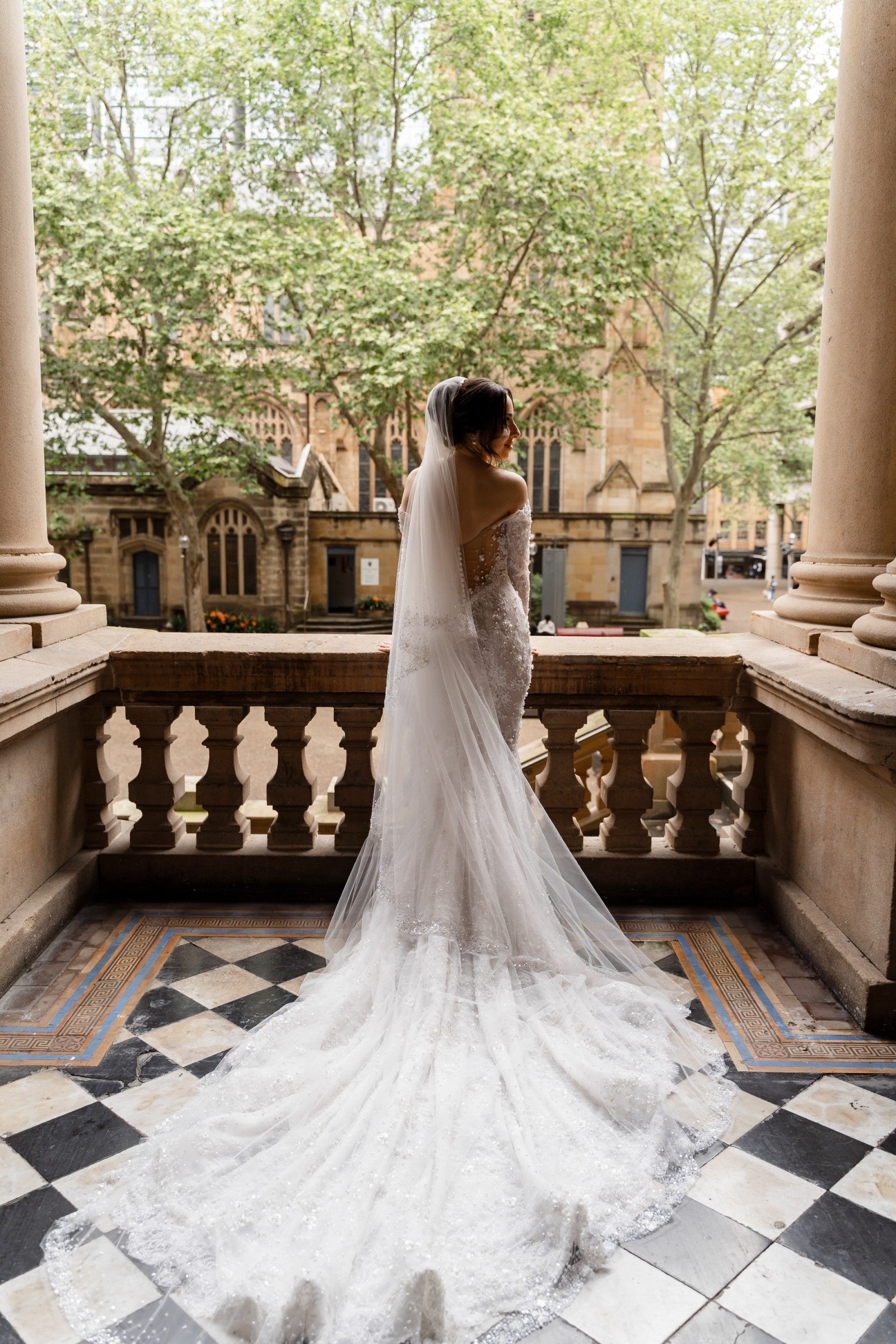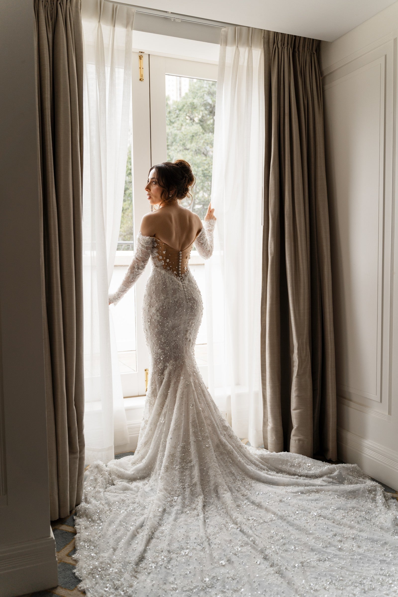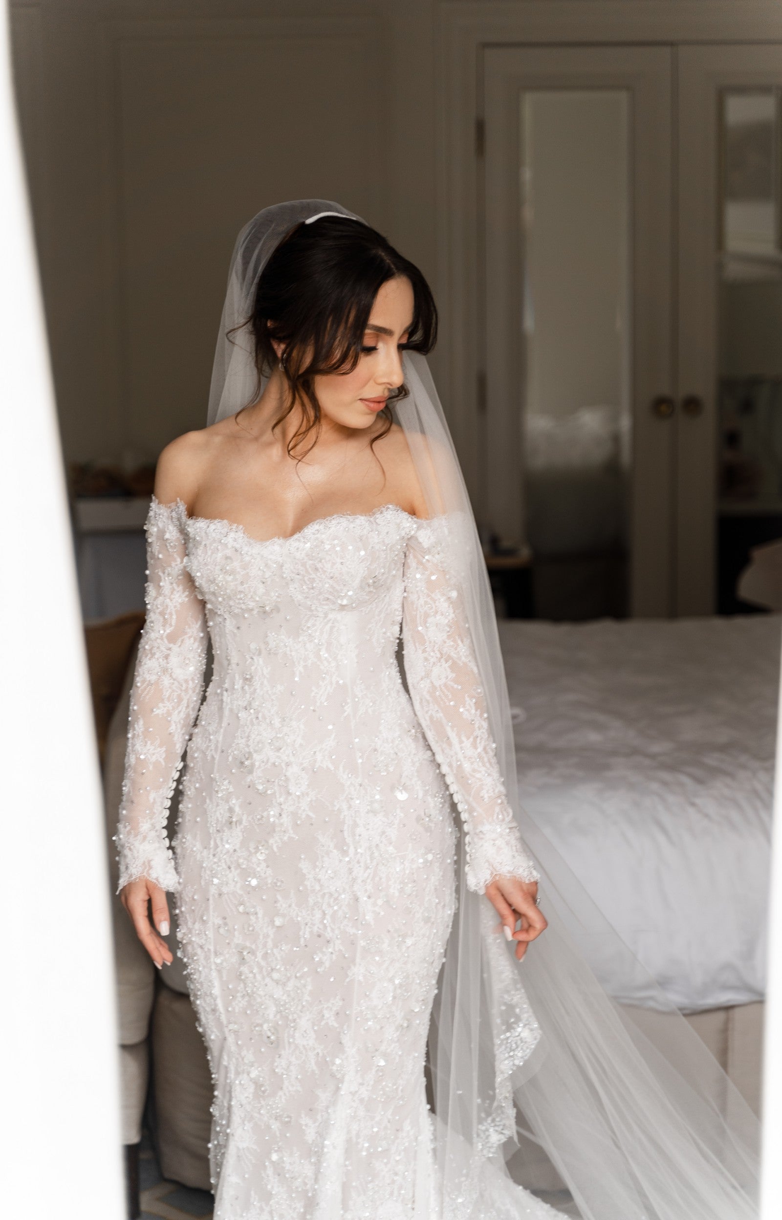 Or elevate your #weddingday with #style C2024-LDG88 gown. This stunning off-shoulder design, adorned with intricate beaded lace, evokes a sense of #timeless elegance. The long sleeves add a touch of refinement, while the cathedral train inspired by Leah Da Gloria offers a #dramatic entrance. Say "I do" in style.