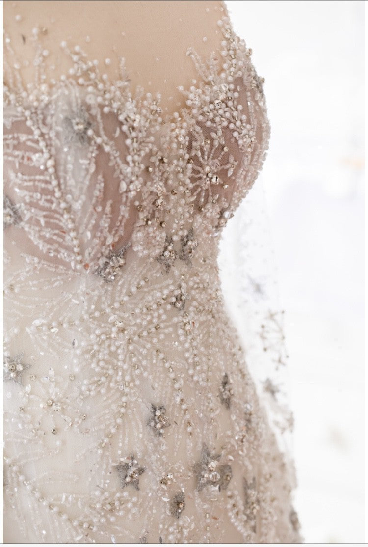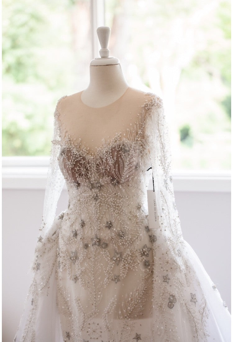 Get this crystal beaded wedding gown with sheer long sleeves & illusion neckline as pictured or with ANY chanes.