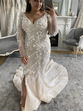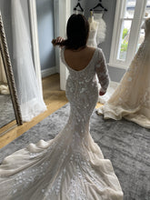 Get this Sheer long sleeve fitted wedding gown with scoop back and v-neck line created as shown or with any design changes.