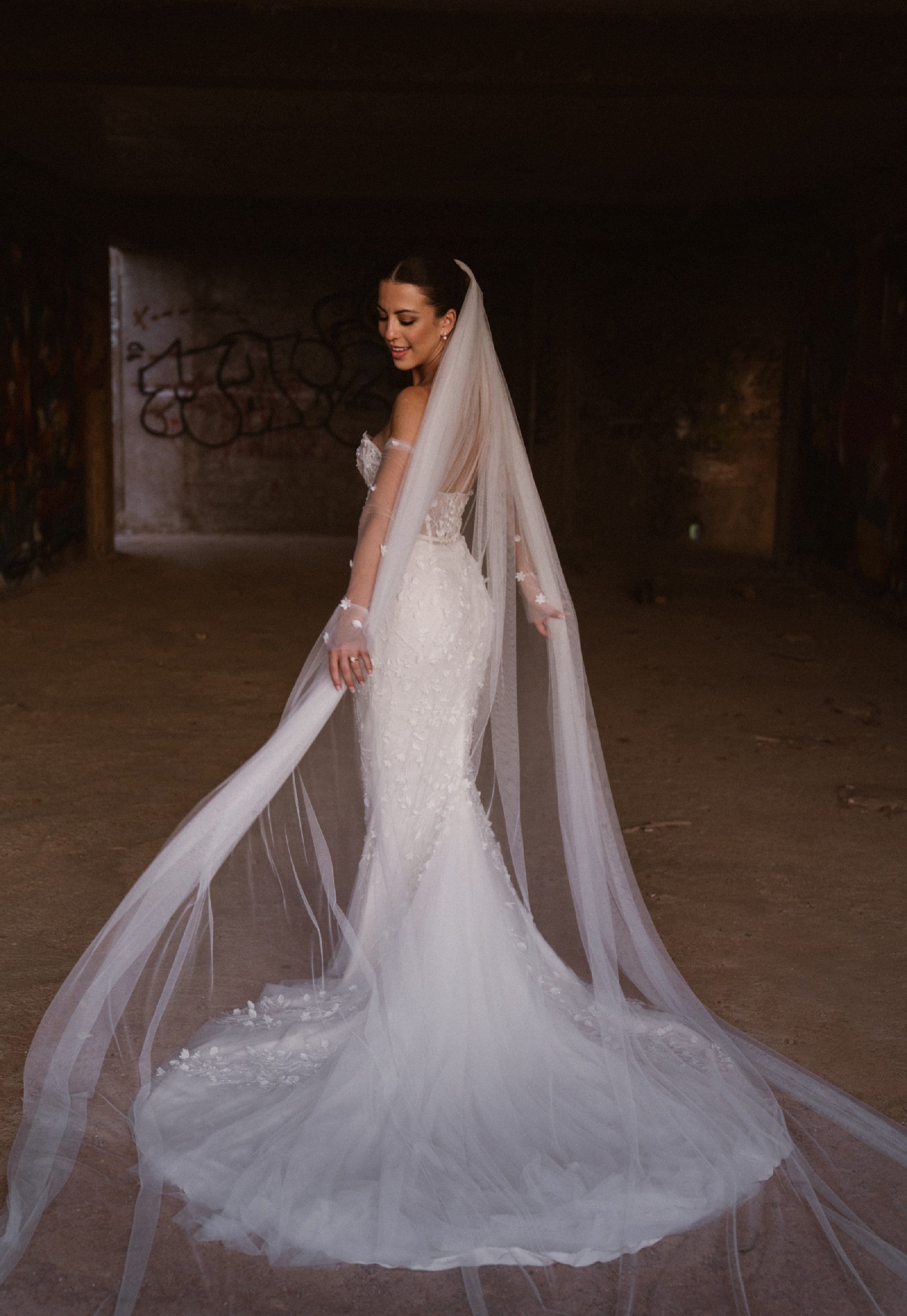 This elegant wedding gown features a strapless sweetheart neckline, beautifully structured with a corset bodice that accentuates your curves. The detachable sheer sleeves add a touch of romance and versatility, making this the perfect choice for any bride looking for sophistication and style on her special day.