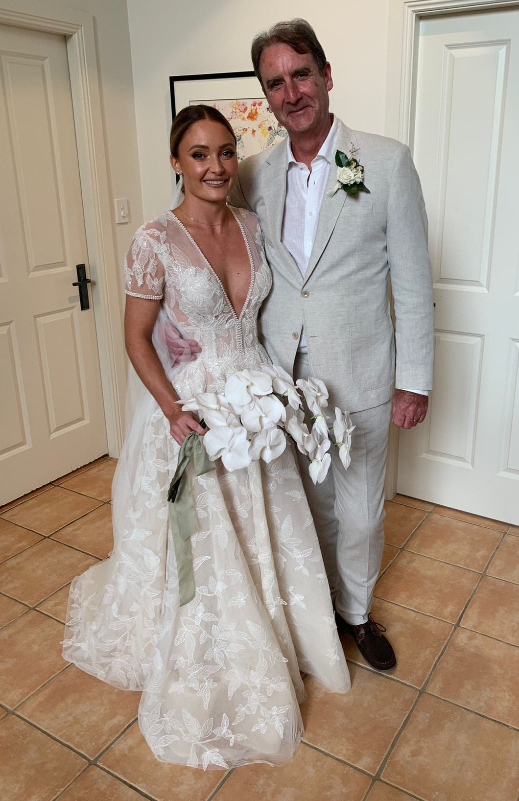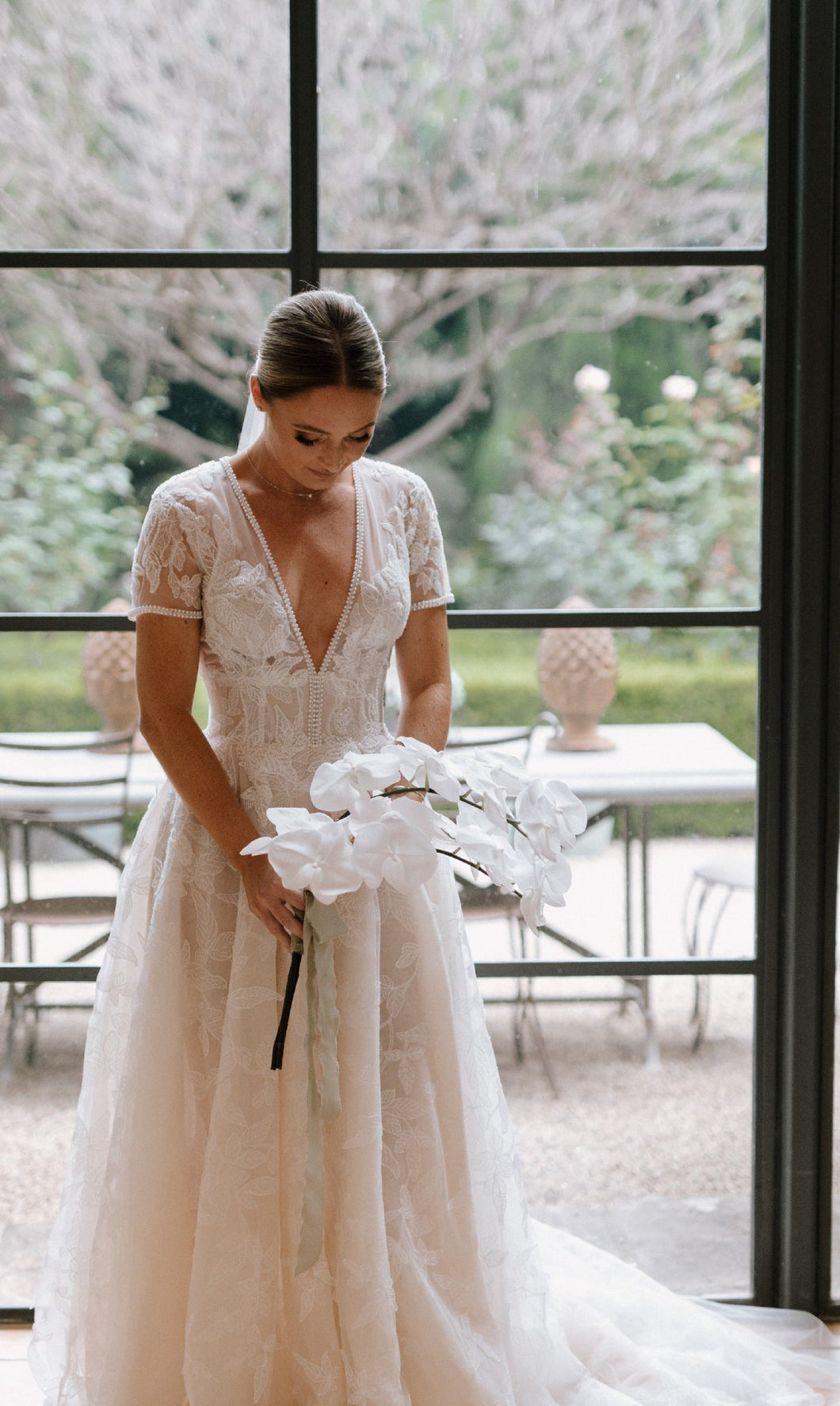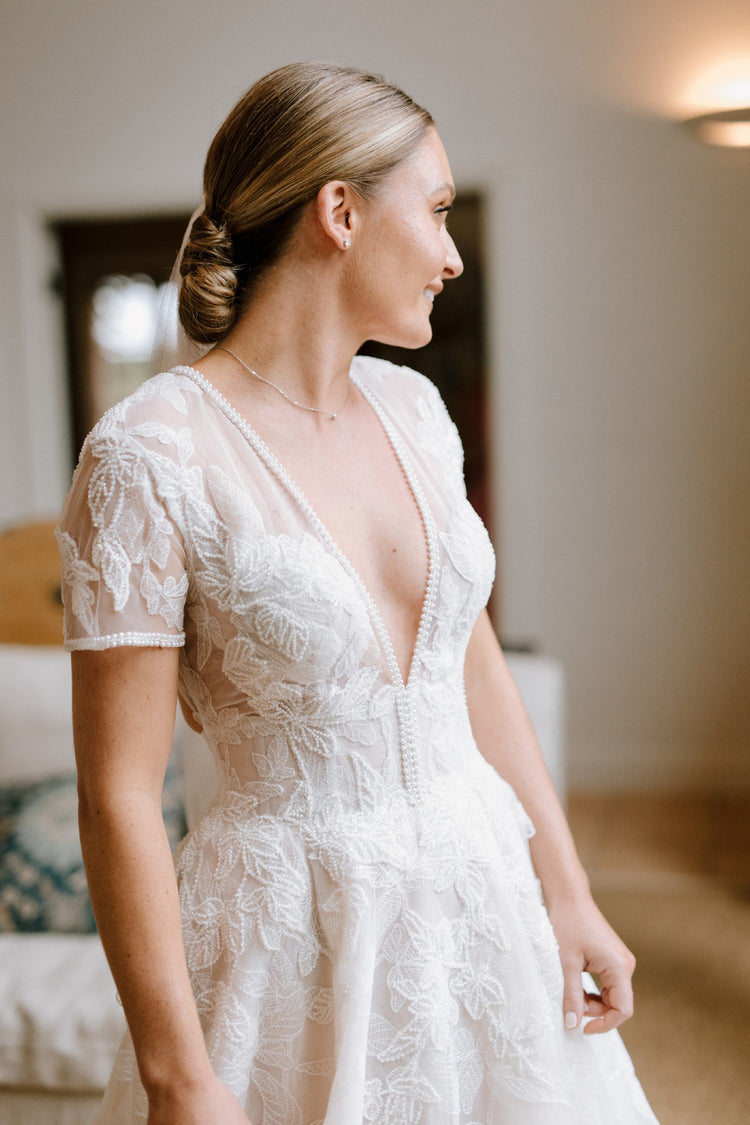 Elevate your wedding day look with our C2024-SSA53 gown. The short sleeves and A-line silhouette create a classic, elegant style, while the v-neckline adds a touch of allure. Perfect for a sophisticated bride seeking a timeless and luxurious look.