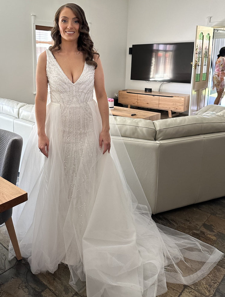 Indulge in #luxury on your #special #weddingday with our C2024-VSB639 wedding #gown. Made with intricate beading and a #sexy deep v-neck bustline, this sleeveless #dress exudes #elegance and sophistication. You'll feel like a work of #art walking down the aisle in this exclusive design.