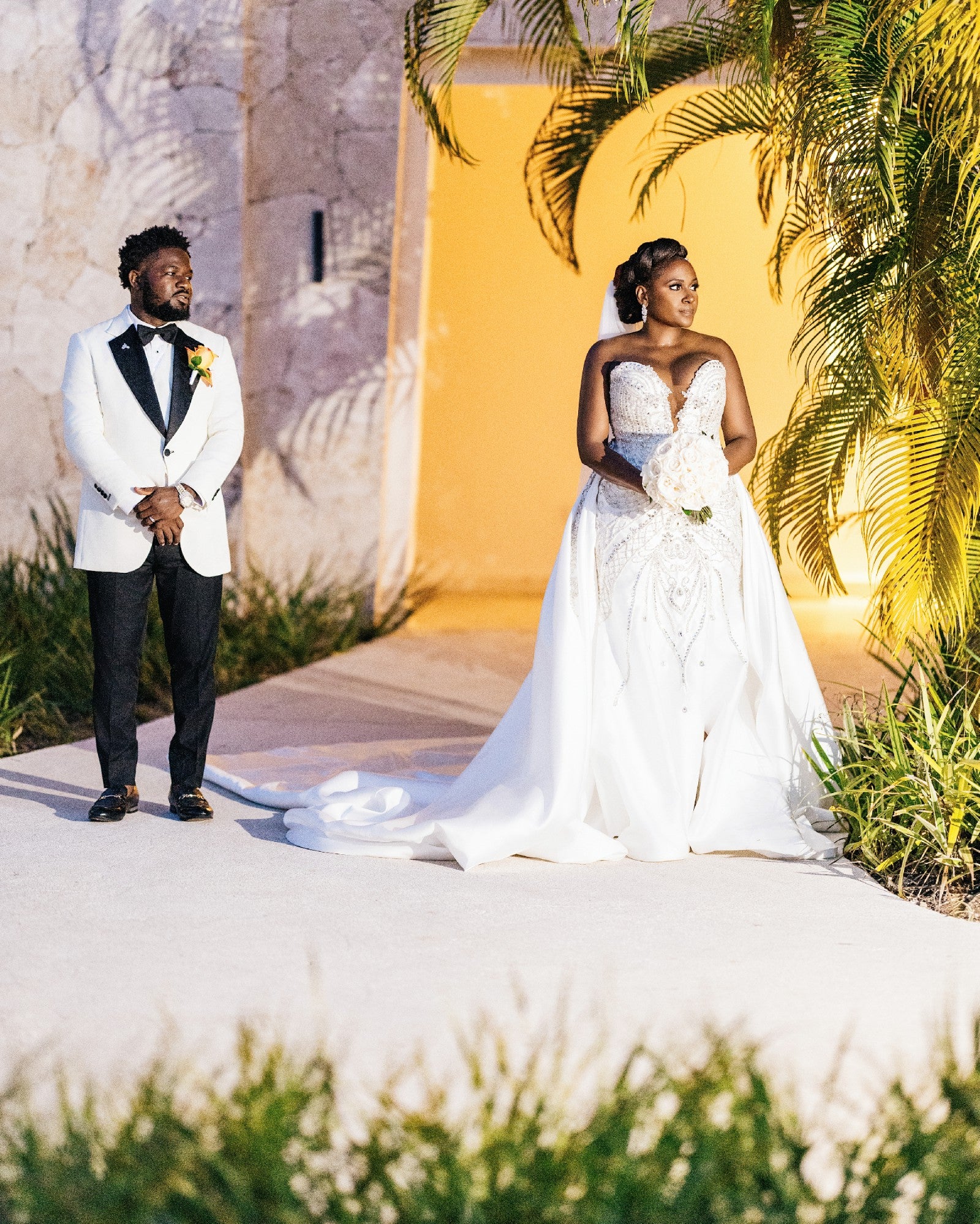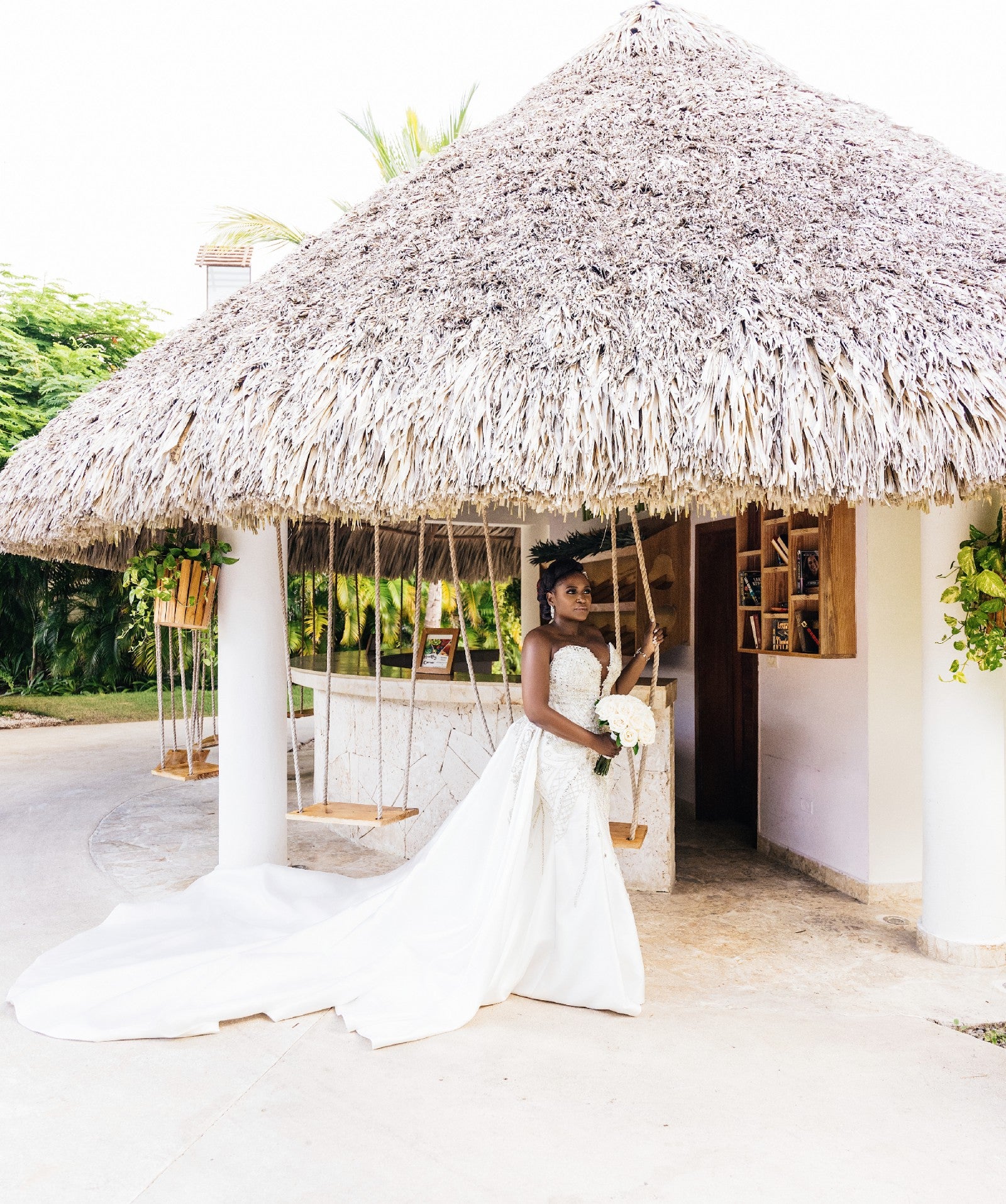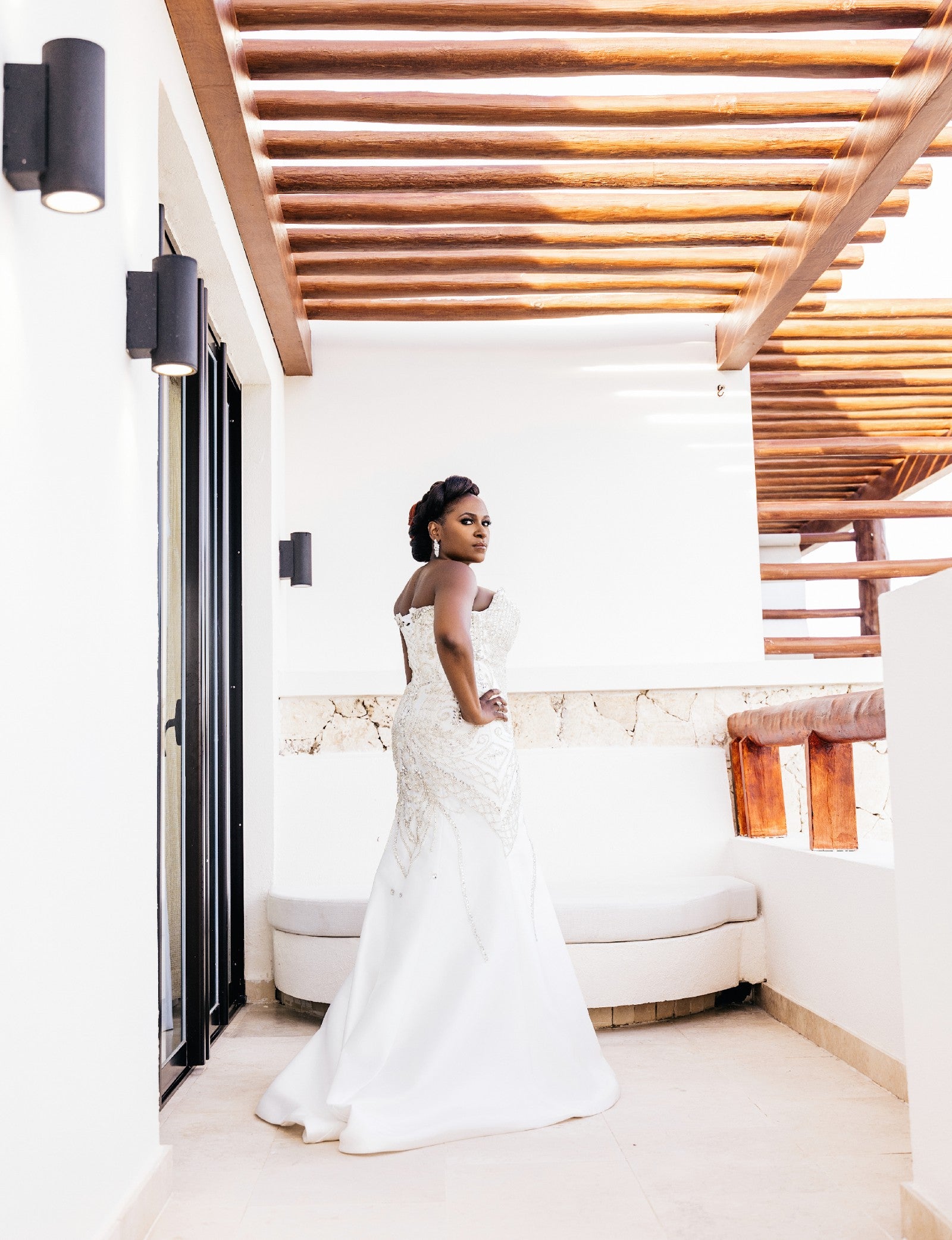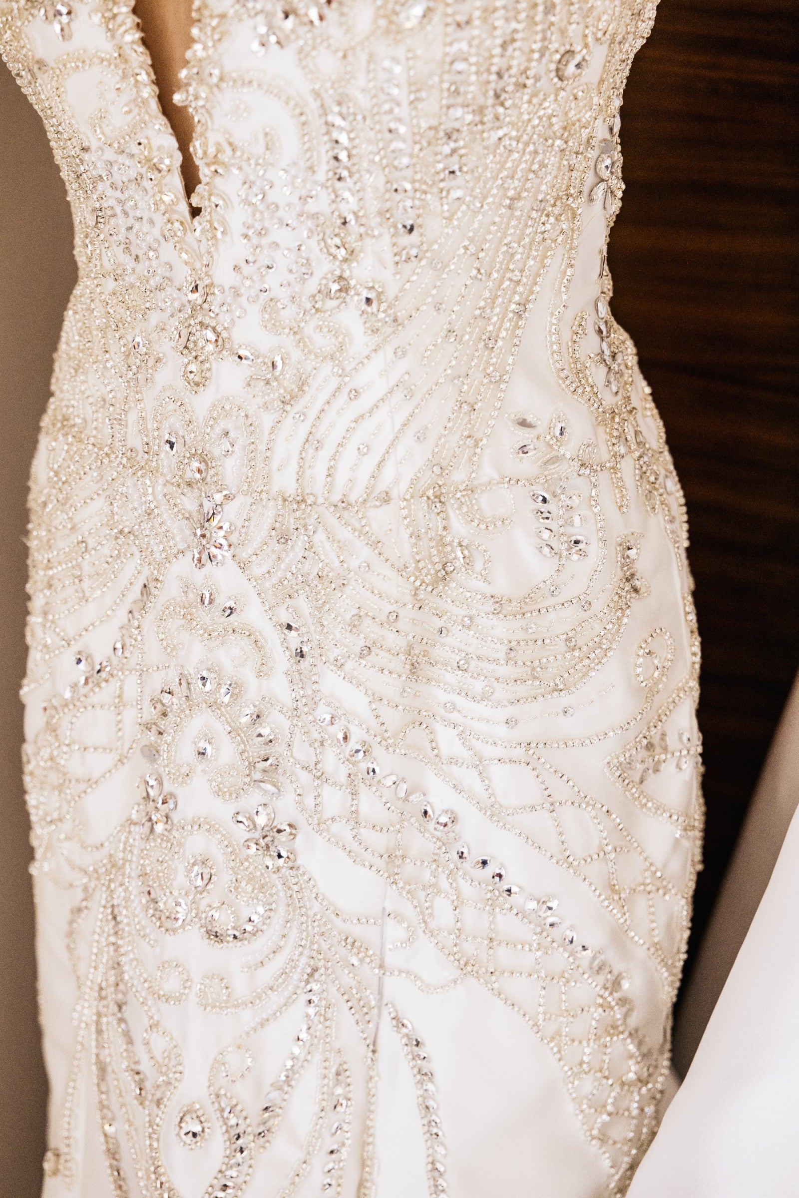 This expertly crafted strapless wedding gown features meticulously detailed beadwork that elevates its refined silhouette. The thigh-high split introduces a sophisticated yet bold element, harmonizing classical elegance with modern design. Tailored to accentuate the neckline and shoulders, this gown embodies a perfect balance of artistry and contemporary #bridal #fashion for a commanding presence on your #weddingday.
