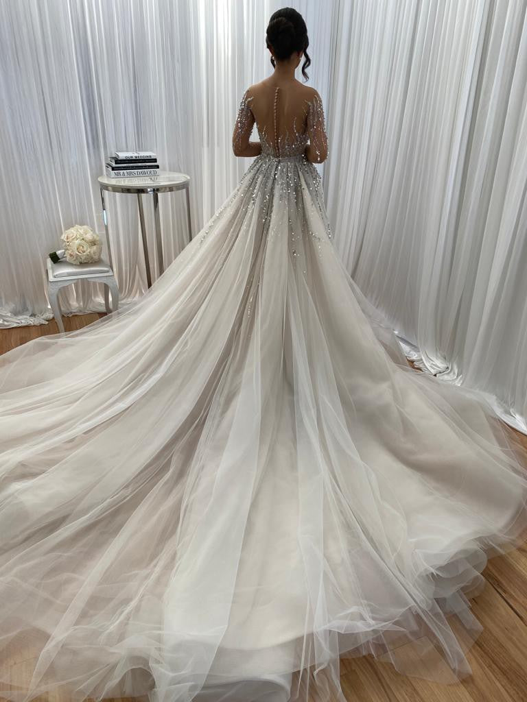 This sheer illusion neckline crystal beaded wedding gown can be made with any custom changes.