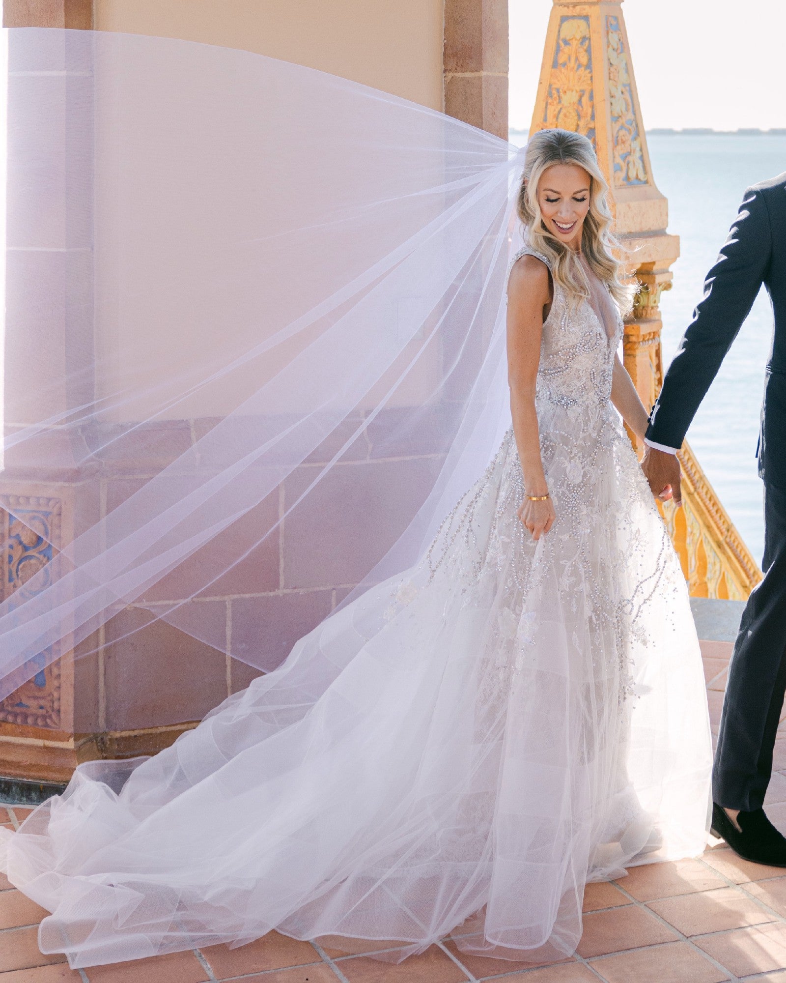 Get this sleeveless v-neck 3D beaded a-line wedding gown customized however you need.