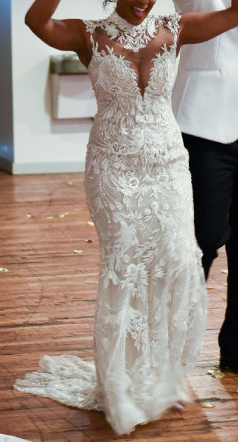 This cap sleeve embroidered wedding gown can be created ass shown or with any changes.
