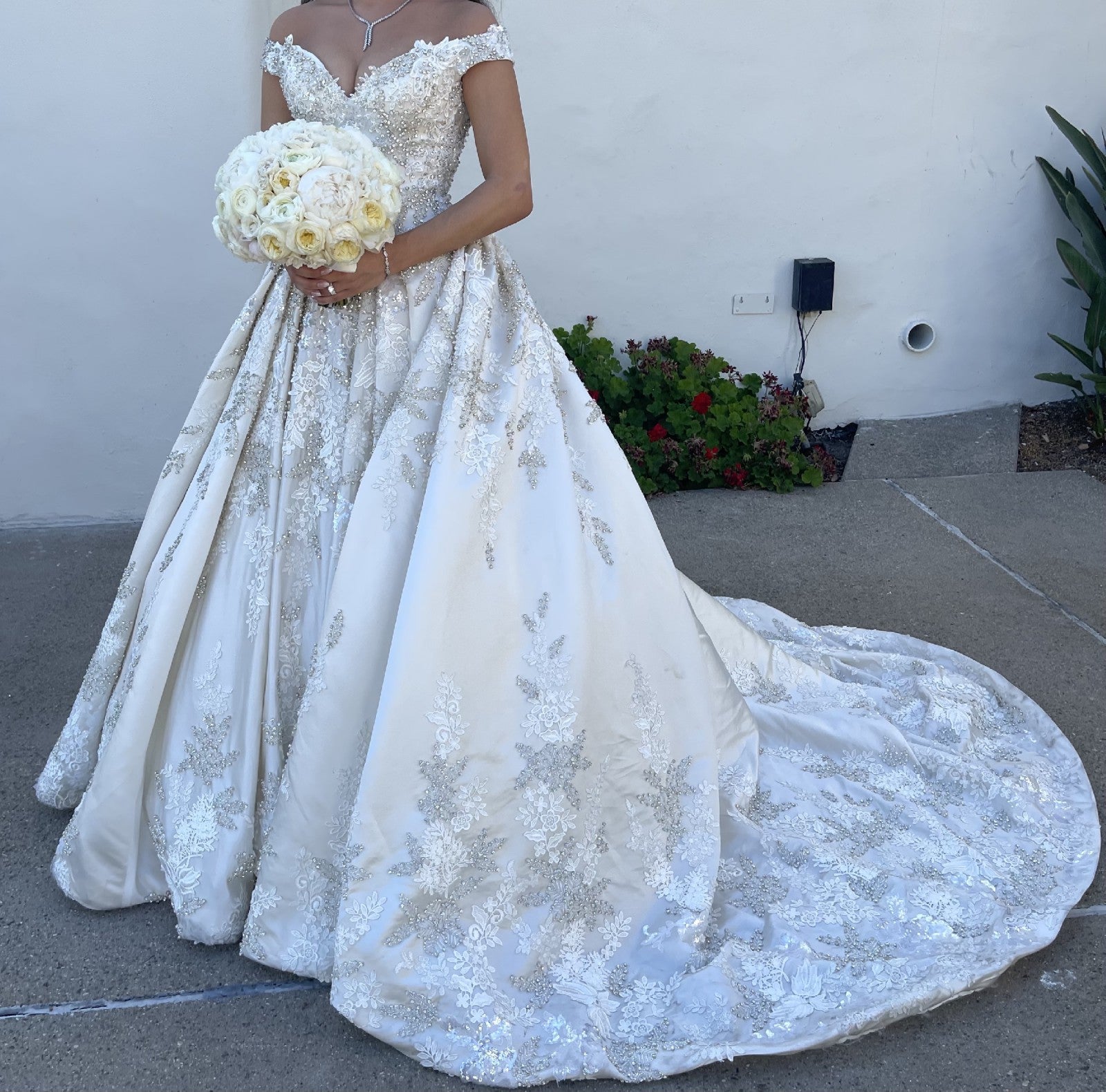 This beaded off the shoulder ball gown wedding dress can be made as shown or with any changes.