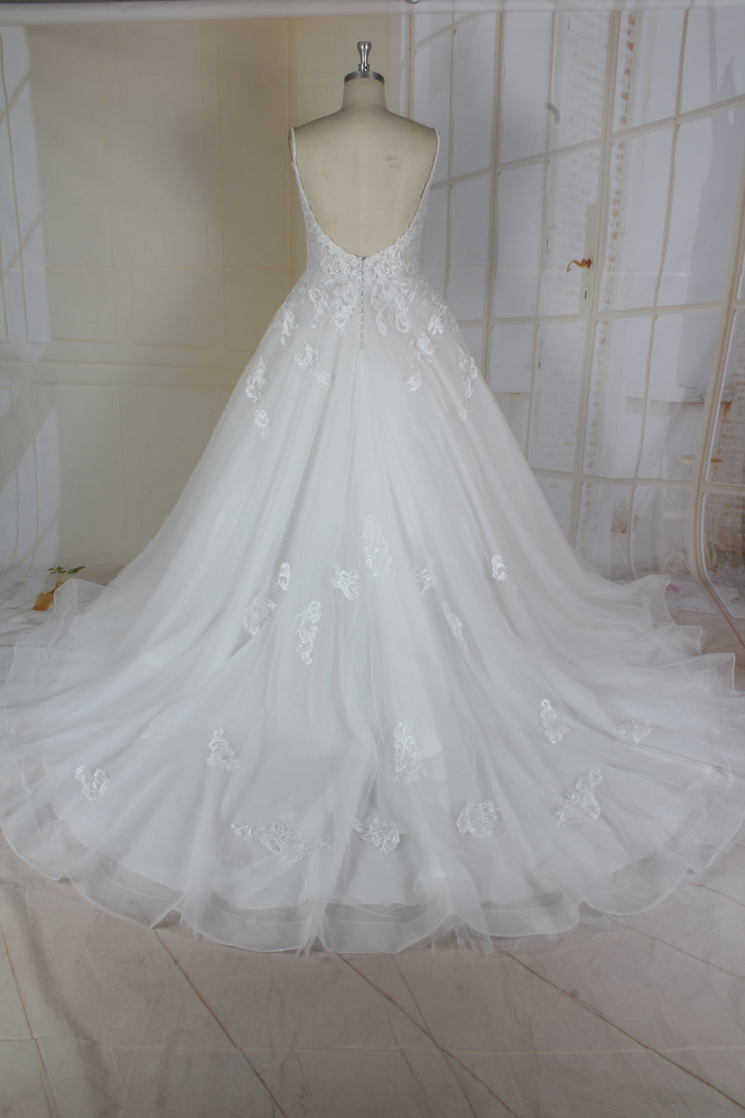 This a-line style wedding dress has spaghetti straps and a ball gown feel. You can have this bridal gown made in nay size and with any changes. We can also make custom wedding dresses based on any picture you have as inspiration. Contact us for more details.