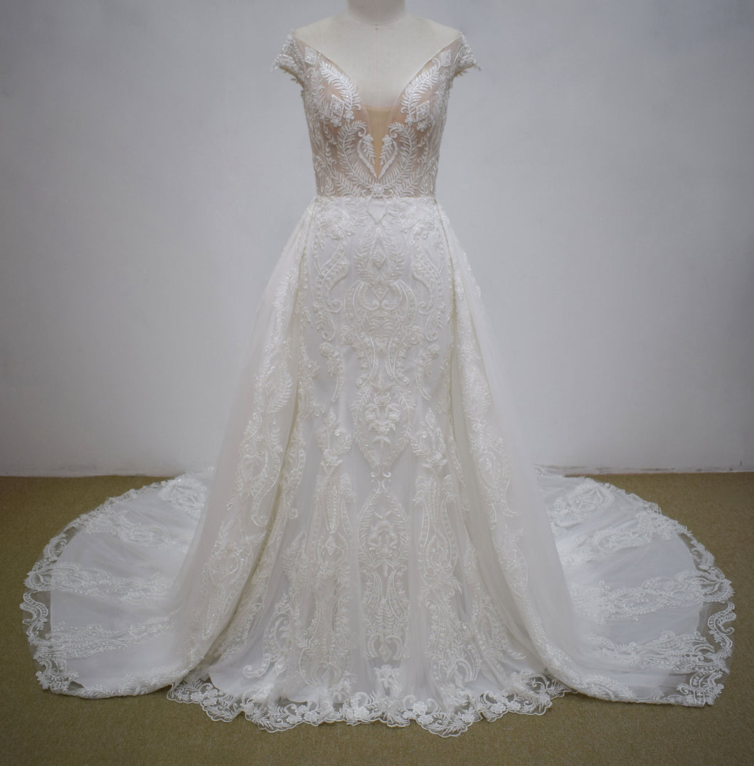 This elegant cap sleeve embroidered wedding gown is the absolute epitome of luxury. Its intricate detailing is reminiscent of artisanship and crafted with the utmost attention to detail. Crafted with exquisite fabric that is sure to make a statement, this breathtaking gown will have you feeling like royalty on your special day.