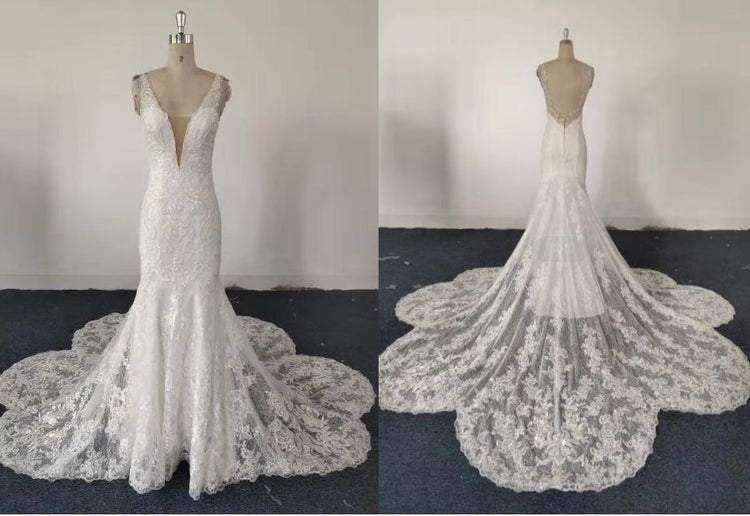 Style QM001 - Sleeveless deep v-neck lace wedding gown