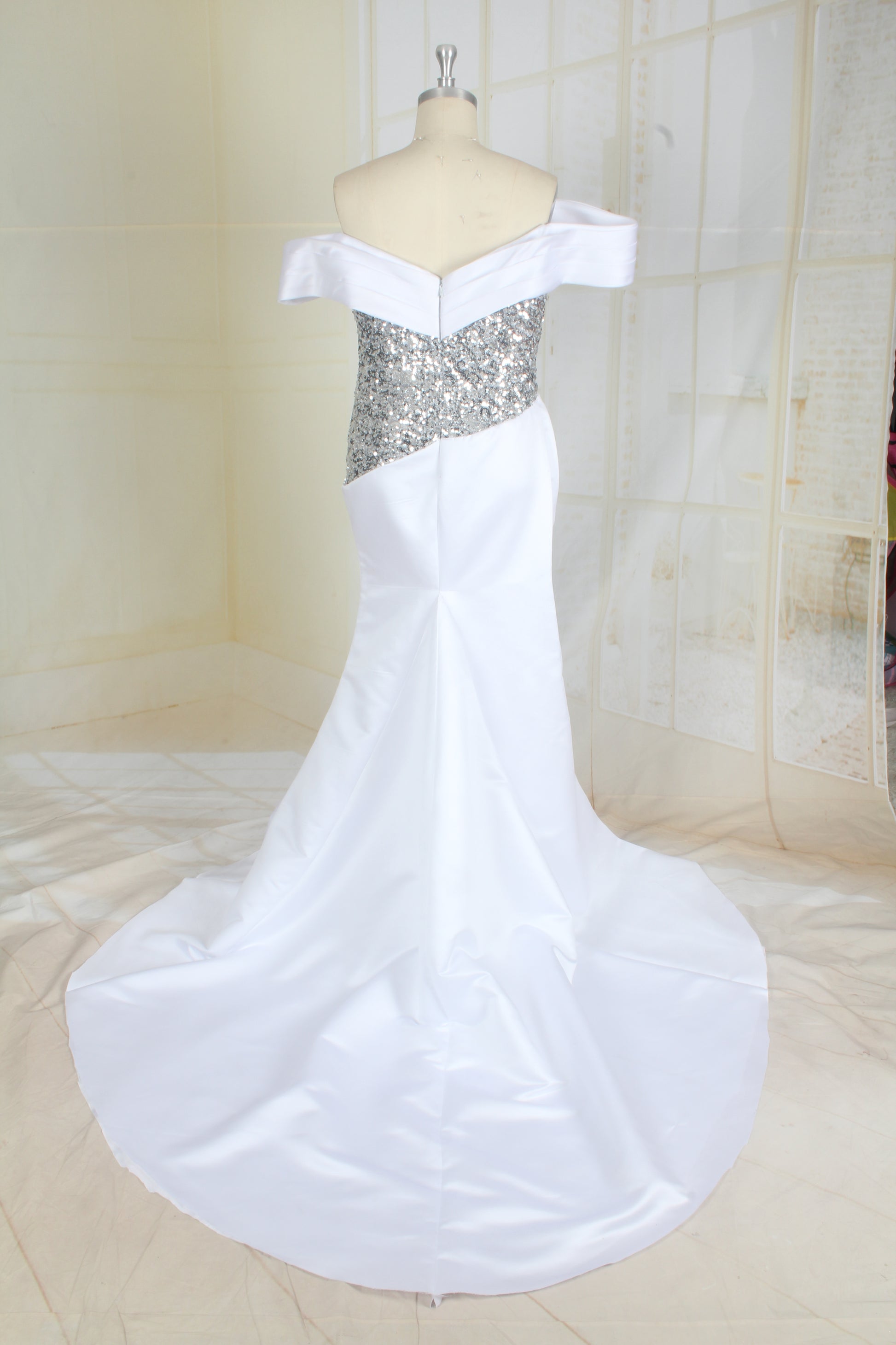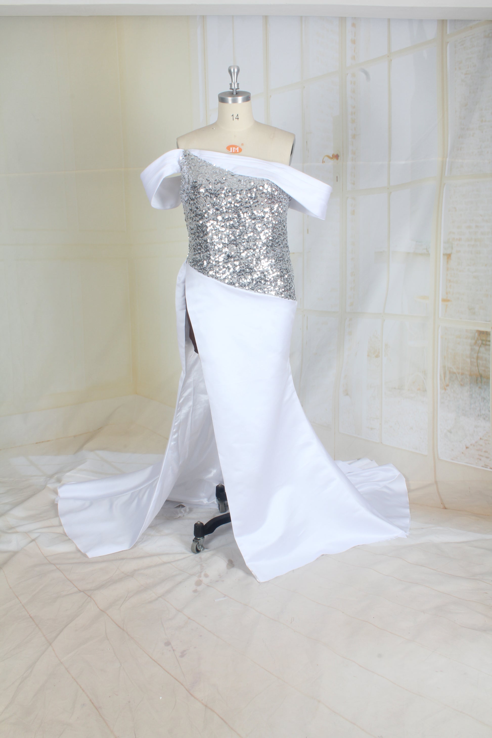 This White Off the shoulder evening gowns with split is in stock as shown.